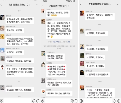 2023年9月18日星期一,當(dāng)芝嘉花園社區(qū)早上響起防控警報(bào)的那一刻,在掌上云的微信群里,大家不約而同的紛紛發(fā)表自身的感悟,提醒讓我們銘記歷史,勿忘國恥,自強(qiáng)不息。繼承先烈遺志,向烈士致敬,是您喚醒了沉睡的中國,是您用鮮血開啟了一個(gè)新的紀(jì)元,您們是中華民族的驕傲,是中華民族的象征。我們更應(yīng)當(dāng)珍惜此刻的生活,為祖國的繁榮昌盛而奮斗!