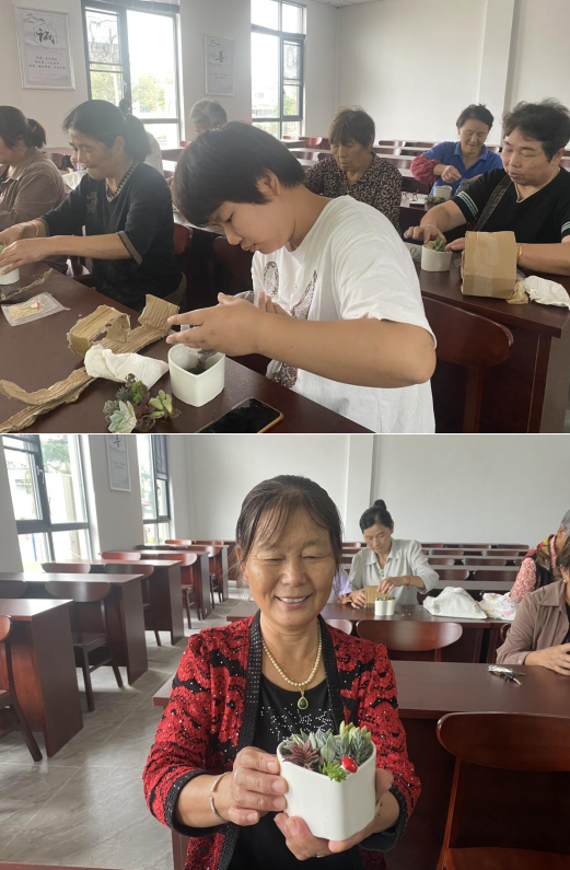 接下來,志愿者們指導(dǎo)大家選擇和搭配植物,并親自幫助他們制作獨(dú)特的盆栽。這不僅是一項(xiàng)具有藝術(shù)性的手工活動,更是一種放松和享受過程的方式。殘疾村民們在制作盆栽的過程中感受到了和植物的連接,平靜了內(nèi)心,獲得了一份屬于自己的小小幸福。最后,社區(qū)志愿者與殘疾村民們合影留念,共同記錄下這個美好的時刻。