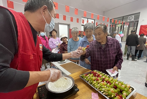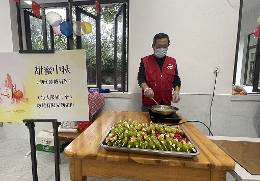 甜蜜中秋(制作冰糖葫蘆),社區(qū)志愿者為居民仔細(xì)講解了冰糖葫蘆的古老傳說和制作步驟,現(xiàn)場熬制糖稀,并邀請居民上前觀看。糖稀熬制完成后,居民用竹簽棒把各種水果串成小串,然后放進(jìn)糖稀里,均勻沾滿糖漿,一串串誘人的冰糖葫蘆就制作完成了。居民們滿足地吃著自己親手制作的冰糖葫蘆,臉上洋溢著幸福的笑容。