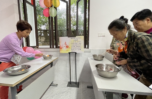 花好月圓(制作月餅),社區(qū)志愿者們將面粉、餡料、模具等一系列原材料,準(zhǔn)備妥當(dāng),并現(xiàn)場教學(xué)?,F(xiàn)場呈現(xiàn)一片繁忙的景象,居民們一邊揉搓面團(tuán),一邊壓膜,連小朋友都積極的參與進(jìn)來??粗约河H手制作的月餅,大家臉上都洋溢著幸福的笑容,香甜的味道縈繞在大家鼻尖,感受著濃濃的節(jié)日氛圍。