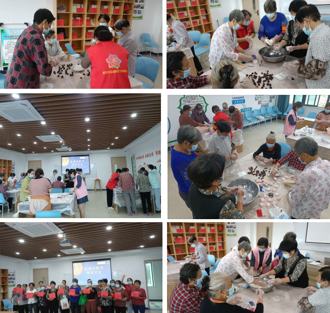 接下來是制作月餅環(huán)節(jié),志愿者分別介紹餅皮、餡料、模具等制作材料的用量和制作方式,并詳細指導月餅的制作過程。老人們摩拳擦掌,動手揉餅皮、加餡料、包月餅、放入模具按壓成型,一邊探討著月餅的制作方法,一邊互相傳遞鮮花、花生、葫蘆、小兔子等形狀的月餅模具。經過近一小時的制作,一個個色澤鮮艷、小巧玲瓏的月餅呈現在每個人的手中,并由社區(qū)志愿者組織集體合影留念,定格美好瞬間。