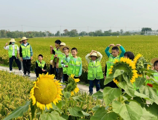 “你看水稻是不是和我一樣高?”“我發(fā)現(xiàn)這粒稻子熟透了”“稻米好香呀,但是嘗起來好像沒什么味道。”大家迫不及待地走近稻田里摸一摸、聞一聞、比一比,熱烈地討論著自己的發(fā)現(xiàn)和收獲。繼續(xù)往前走便發(fā)現(xiàn)了一片金黃燦爛的向日葵地,孩子們沿著小路在田間肆意奔跑,盡顯童真童趣。