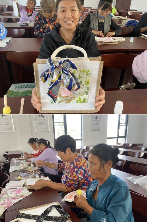 而后,志愿者們通過(guò)PPT和視頻的形式,向大家展示了手工制作蝶骨巴包的方法和注意事項(xiàng)。每人都收到了一個(gè)帆布包制作材料包,志愿者們引導(dǎo)大家自行發(fā)揮想象力,激發(fā)創(chuàng)意,開(kāi)始進(jìn)行制作。一雙雙靈巧的雙手在活動(dòng)室里翻飛,一張張笑臉在每個(gè)人的臉龐綻放,充滿(mǎn)了童真與喜悅。志愿者們不辭辛勞地幫助每一位需要幫助的村民,耐心地解答他們遇到的問(wèn)題。大家相互之間分享了制作過(guò)程中的心得和體會(huì),互相鼓勵(lì)和贊美。