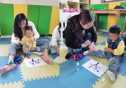 接下來的手工活動(dòng)更是成為了活動(dòng)的亮點(diǎn)。教師引導(dǎo)孩子們觀察一顆彩色的樹,并提出問題引發(fā)幼兒的思考,孩子們積極回答樹上的花是什么顏色以及形狀。隨后,教師示范了如何用皺紋紙制作樹上的花,讓孩子們親自動(dòng)手參與制作。通過這個(gè)過程,孩子們不僅學(xué)會(huì)了觀察和模仿,還培養(yǎng)了他們的動(dòng)手能力和創(chuàng)造力。此外,志愿者提供了黏土,讓孩子們在樹上未開花的部分添加花瓣,使樹變得更加美麗。