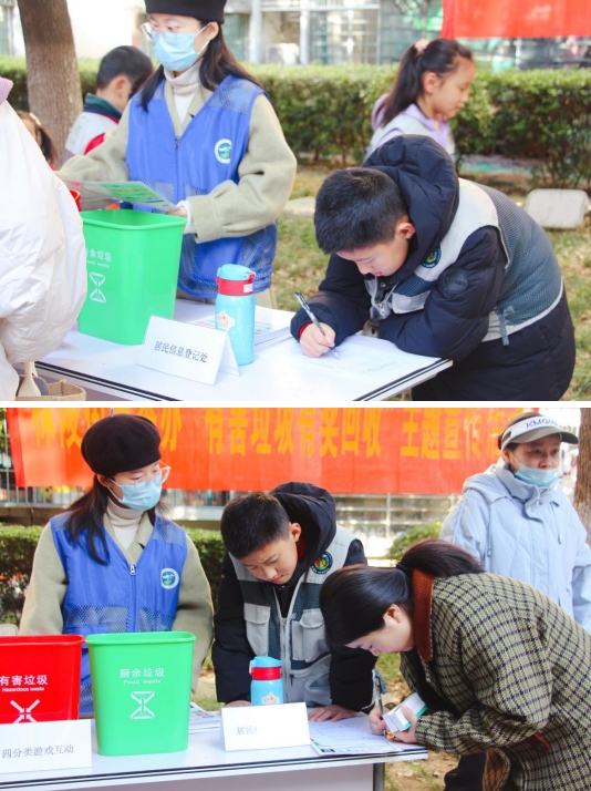本次活動(dòng)共設(shè)置4個(gè)攤位,分別是:四分類(lèi)游戲互動(dòng)、居民信息登記處、有害垃圾回收處、志愿者招募處。