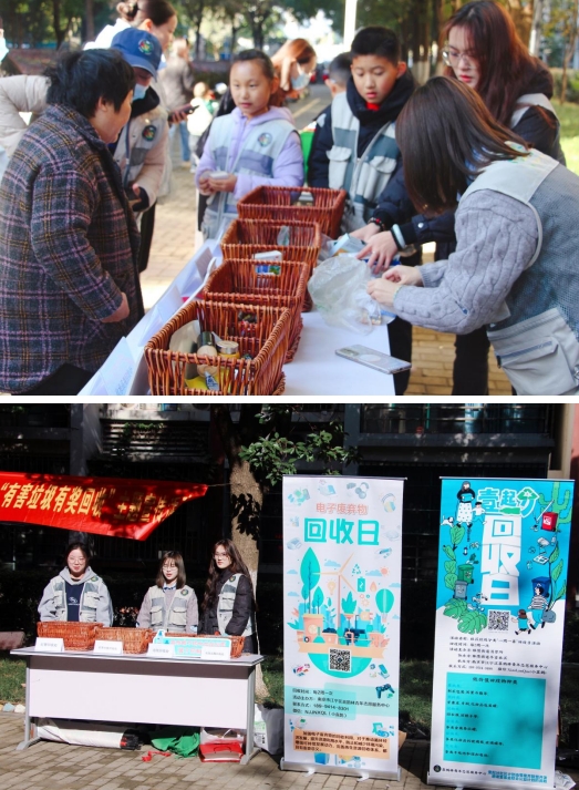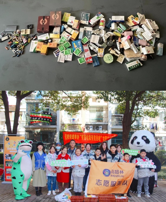 居民紛紛拿出家中的廢舊電池、廢棄燈管、廢棄化妝品瓶等交由志愿者進(jìn)行回收。