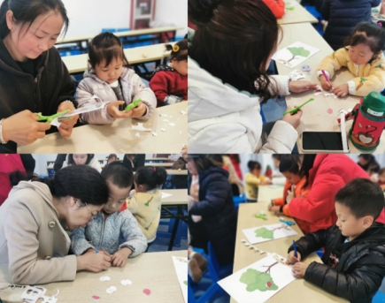 繪本故事結(jié)束后,社區(qū)志愿者繼續(xù)帶領(lǐng)小朋友們開始了手工——家庭樹的制作。每一顆蘋果果實(shí)就代表了一個(gè)愛自己的家人,小朋友們仔細(xì)地剪,細(xì)致的貼,又在蘋果上畫了每一個(gè)家庭成員的頭像。一些會(huì)寫字的小朋友,不僅畫了頭像,還在旁邊寫上了愛的稱呼,爸爸、媽媽、爺爺、奶奶等等。在制作家庭樹的過程中,一同陪伴孩子參與活動(dòng)的家長也和孩子們有愛的交流著,討論著每個(gè)家人的頭像該怎么畫,感受到了孩子與家人之間的親密情感,有愛的關(guān)系。