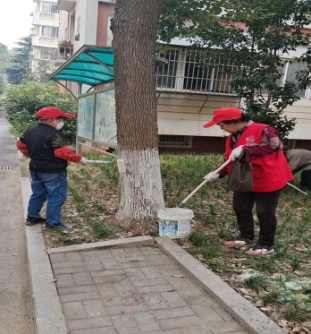 活動中,社區(qū)志愿者們按要求給每棵樹標定1.2米的基準線,頂端纏繞紅色膠帶,然后利用生石灰、防蟲藥劑等混合配比液進行刷白。刷白后不僅能夠防蟲防凍,還起到美化效果。在保護好樹木的同時,志愿者還將林帶內(nèi)的垃圾、雜物、雜草進行清理。大家通過分工合作,耐心仔細地為大樹披上了一件又一件健康、溫暖的白色“冬衣”,為社區(qū)增添了一道亮麗的風(fēng)景線。