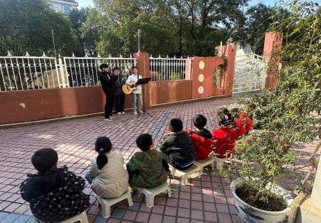 講座結束后,果場社區(qū)和鐘山職業(yè)技術工程學院的志愿者們還為孩子們準備了吉他彈唱,和孩子們共唱兒歌,祝愿孩子們都能茁壯成長。