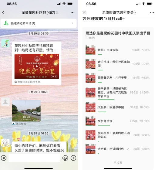 國(guó)慶期間,龍?zhí)督值阑▓@村黨委舉辦了“夢(mèng)圓中秋 月圓中秋——迎盛會(huì) 聚鄰里 黨群攜手心連心”中秋國(guó)慶文藝匯演,社區(qū)居民積極報(bào)名參與文藝匯演,載歌載舞共唱節(jié)慶贊歌,獲得了居民的好評(píng)。匯演結(jié)束,花園村依托“掌上云社區(qū)”開展線上評(píng)選活動(dòng),邀請(qǐng)居民線上為喜歡的節(jié)目投票。