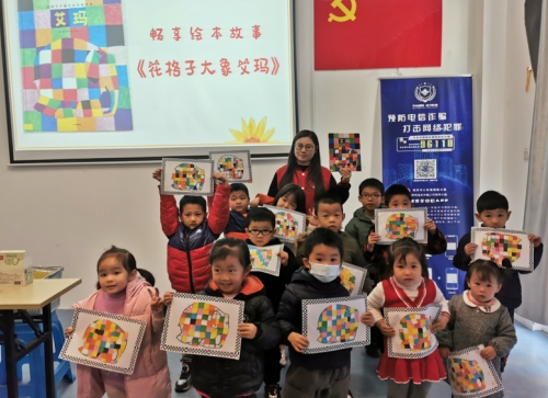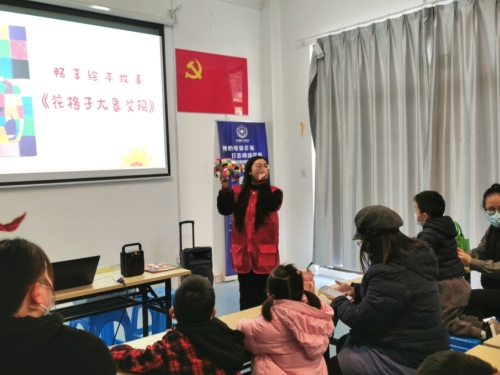 積分制志愿者以繪本故事《花格子大象艾瑪》展開了活動,像孩子們講述了一只叫艾瑪?shù)拇笙?,從設法接受自己的獨特,到善用自己的與眾不同,轉(zhuǎn)換為他獨特的幽默感,帶給大家歡樂的故事。