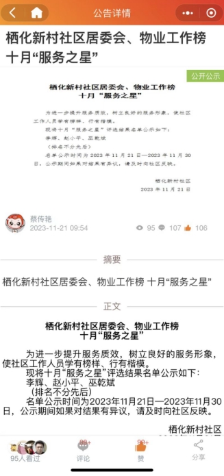 11月27日,棲化新村社區(qū)在“掌上云社區(qū)”內(nèi)開(kāi)展“服務(wù)之星”評(píng)比活動(dòng)。該活動(dòng)旨在樹(shù)立正向榜樣,激勵(lì)社區(qū)工作人員為居民提供更優(yōu)質(zhì)的服務(wù)。