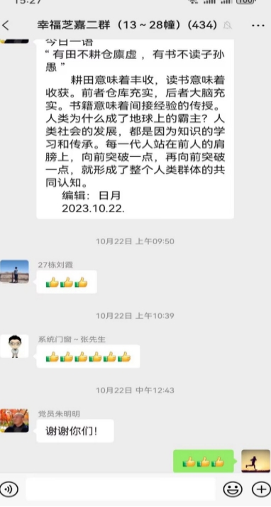 雖然這看似不起眼的小事情,但正是他的堅(jiān)持讓這一切發(fā)生。尤其在2020年疫情最嚴(yán)峻的時(shí)候,居民們基本上都不外出,大多數(shù)時(shí)間都在家中刷手機(jī)。這種情況下,朱明明依舊堅(jiān)持不懈,給微信群中的居民傳播每天的正能量,讓他們感受到了無盡源源的激勵(lì)。