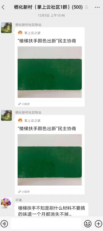 為確定樓道扶手的出新顏色,12月14日,棲化新村社區(qū)開展“掌上云社區(qū)”民主協(xié)商,通過線上與線下相結(jié)合的形式,廣泛征求居民的建議。