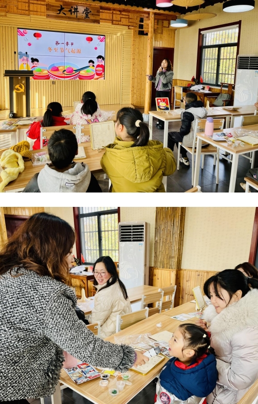 老師首先為社區(qū)的大小朋友們介紹了冬至節(jié)氣的起源、氣候特點、風(fēng)俗習(xí)慣等知識。冬至,又稱日南至、冬節(jié)、亞歲等,兼具自然與人文兩大內(nèi)涵,既是二十四節(jié)氣中一個重要的節(jié)氣,也是中國民間的傳統(tǒng)祭祖節(jié)日。冬至是四時八節(jié)之一,被視為冬季的大節(jié)日,在古代民間有“冬至大如年”的講法。孩子們在聽講的過程中學(xué)到了很多之前不了解的知識,根據(jù)現(xiàn)在的氣候特點真切的感受到冬至節(jié)氣的氣候特點。