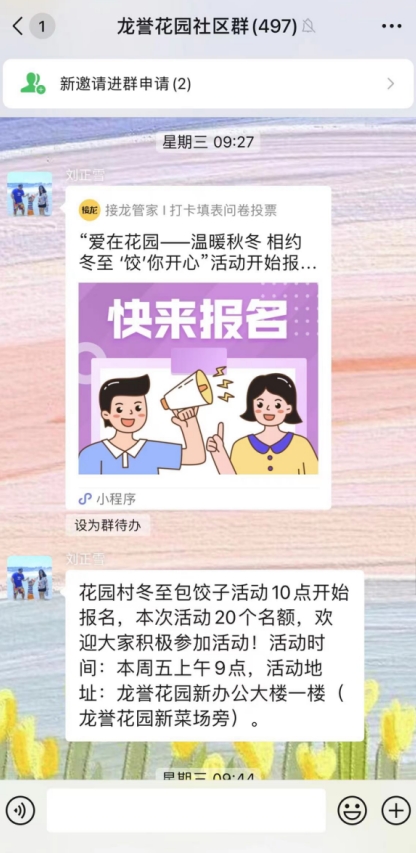 為進(jìn)一步豐富村民業(yè)余文化生活,弘揚(yáng)中華傳統(tǒng)文化,提高村民生活幸福感,讓村民們更好地感受節(jié)日氛圍。南京市棲霞區(qū)龍?zhí)督值阑▓@村委會利用“掌上云社區(qū)”小程序發(fā)布冬至活動招募,線下社區(qū)“掌上云社區(qū)”志愿者開展“溫暖秋冬 相約冬至”主題活動。