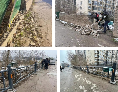 12月20日,正值雨雪天氣,石壩社區(qū)網(wǎng)格員在“181平臺巡查時發(fā)現(xiàn)府軍衛(wèi)近變電站處道路上有一處圍墻有倒塌跡象,加上雪的覆蓋,顯得此處圍墻更是搖搖欲墜,并且緊貼圍墻南側(cè)有一處供居民行走的臺階,大大加深了出現(xiàn)安全事故的隱患。為了預防事故的發(fā)生,保證居民的安全出行,石壩社區(qū)在街道幫助下組織人工立即對圍墻進行拆除并在周圍立起警示牌提醒路人注意安全,經(jīng)過2個小時的努力,原本圍墻已全部拆除。拆除完畢后,石壩社區(qū)組織工人將拆除的空缺部位及時嵌入護欄,預防安全事故的發(fā)生。