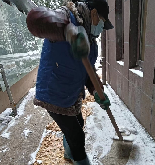 在12月18日中午,向上社區(qū)已經(jīng)和鴻福城物業(yè)就積雪一事召開(kāi)臨時(shí)會(huì)議,動(dòng)員社區(qū)工作人員、物業(yè)工作人員、退役軍人、積分制志愿者組成一支支驍勇善戰(zhàn)的“破冰”沖鋒隊(duì),在寒意逼人的冬日里“雪中起舞”,全力開(kāi)展清雪除冰工作。要求于16時(shí)開(kāi)始清掃主干道以及人行道積雪,于19日6時(shí)繼續(xù)清掃積雪。