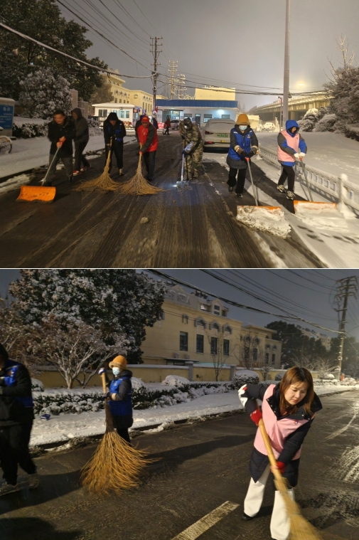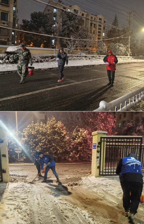 當晚所有工作人員待命,雪稍微小了一些,在黨委書記的安排下,大家有條不紊地開展掃雪工作。書記帶領著幾名女同志用推雪鏟在前方開路,幾名男同志用鐵鍬將地面上結的冰鏟松,方便跟在后邊的志愿者用掃帚將道路上殘留的雪和冰清掃到道路兩邊,清出一條可供汽車和行人通行的道路出來。網格員還在道路上撒上鹽,防止道路繼續(xù)結冰。