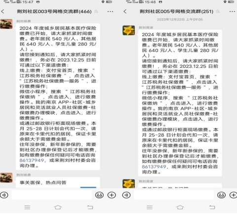 歲末年初,2024年度城鄉(xiāng)居民基本醫(yī)療保險(xiǎn)集中繳費(fèi)工作正如火如荼地展開。南京市江寧區(qū)谷里街道荊劉村為確保轄區(qū)內(nèi)的每一位老百姓享受到2024年的醫(yī)療保障待遇,網(wǎng)格員們通過線上和線下宣傳相結(jié)合的方式進(jìn)行2024年城鄉(xiāng)居民基本醫(yī)療保險(xiǎn)繳費(fèi)宣傳。