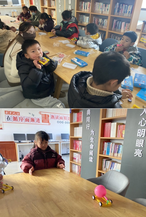 活動(dòng)開始前,志愿者老師通過幾個(gè)互動(dòng)小游戲讓孩子們感受作用力與反作用力,引導(dǎo)孩子們認(rèn)識(shí)反沖力。很快激發(fā)了孩子們的發(fā)散思維,能夠聯(lián)系生活找到很多運(yùn)用反沖力的例子。小朋友們恍然大悟,原來火箭、煙花等都運(yùn)用這一科學(xué)原理。在制作反沖力小車的過程中,孩子們認(rèn)真專注,不太熟練地學(xué)著用皮筋扎緊氣球,吹氣球時(shí)吹得滿臉通紅,可是當(dāng)小車在氣球放氣的反推下快速走動(dòng)時(shí),孩子們一個(gè)個(gè)高興地跳起來,迫不及待地找?guī)讉€(gè)好朋友去進(jìn)行比賽。在比賽中,小朋友們也得出一個(gè)結(jié)論,原來氣體量越大,反沖力就越大,小車也就跑得越快越遠(yuǎn)。在這濃厚的科學(xué)氛圍下,滿足了小朋友們的好奇心,開啟了小朋友們的探索之路。