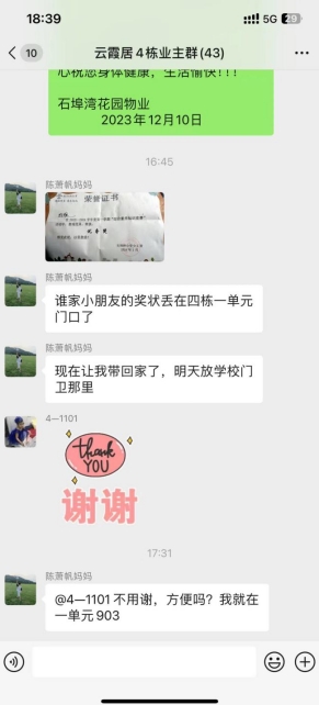 不久之后,一位居民聯(lián)系上了這位熱心居民,聲稱這是他遺失的獎(jiǎng)狀。經(jīng)過(guò)核實(shí)確認(rèn),掌上云社區(qū)的便捷和高效讓失主和熱心居民都倍感欣慰。這一過(guò)程不僅避免了獎(jiǎng)狀的遺失,更讓失主感受到了社區(qū)居民的關(guān)愛(ài)與互助。