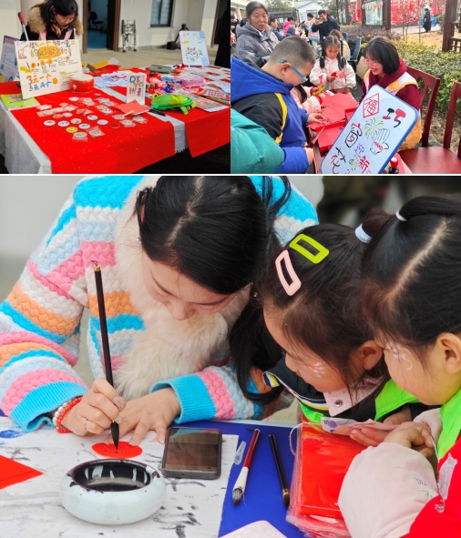 舞臺(tái)表演現(xiàn)場(chǎng)還設(shè)置了傳統(tǒng)文化習(xí)俗展示區(qū)。社區(qū)居民可以在這里親身體驗(yàn)傳統(tǒng)文化的獨(dú)特魅力。新春全家福拍攝活動(dòng)讓居民們記錄下團(tuán)圓時(shí)刻,感受家的溫暖;巧手窗花迎新春活動(dòng)則讓居民們親手剪紙,寄寓著對(duì)美好生活的向往;萬幅春聯(lián)進(jìn)萬家活動(dòng)邀請(qǐng)書法家現(xiàn)場(chǎng)書寫春聯(lián)和福字,為居民們送上新春的祝福;粉妝玉琢,妙筆生花活動(dòng)讓孩子們?cè)谀樕袭嫵雒利惖膱D案,寓意著迎接新一年的美好與希望。此外,“京”彩紛呈畫臉譜、“龍年手作”小神龍燈籠DIY、“玉”見美好,愛的“爆爆”、幸福棉花糖,甜蜜迎新年等環(huán)節(jié)也為居民們帶來了別樣的文化體驗(yàn)。