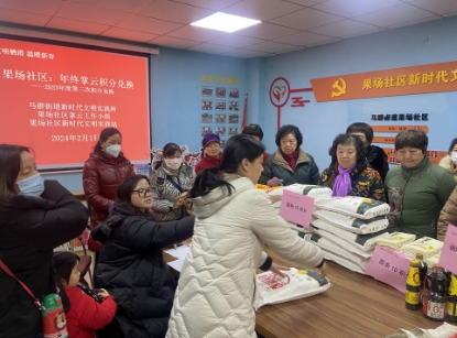 2024年2月1日,南京市棲霞區(qū)馬群街道新時(shí)代文明實(shí)踐所與果場(chǎng)社區(qū)新時(shí)代文明實(shí)踐站進(jìn)行站所聯(lián)動(dòng),社區(qū)掌云工作小組借助實(shí)踐站平臺(tái),向在2023年度參與到社區(qū)基層治理中的由黨員或居民組成的“齊益果”積分制志愿者們進(jìn)行了“文明棲霞 溫暖新春”主題的掌云年終積分兌換活動(dòng)。