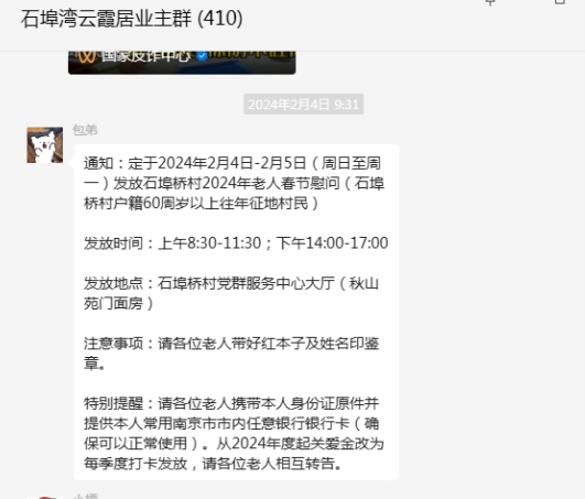 為了讓社區(qū)的老人們度過一個(gè)溫馨、快樂的春節(jié),南京市棲霞區(qū)棲霞街道石埠橋村社區(qū)利用掌上云社區(qū)微信群發(fā)布信息,決定于2024年2月4日至5日,為60周歲以上的往年征地村民發(fā)放春節(jié)慰問金。