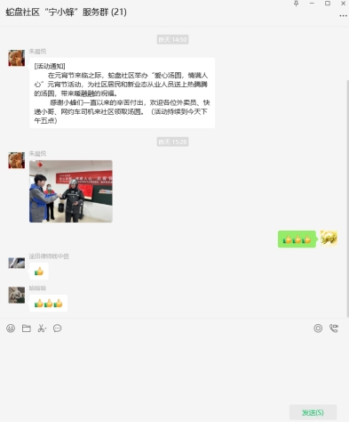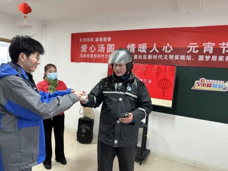 “小哥們辛苦了,來喝碗現(xiàn)煮的湯圓吧!”隨著寧小蜂驛站志愿者一聲聲親切的問候,路過的快遞員、外賣員小哥紛紛駐足觀望:“非常感謝,以后微信群里常聯(lián)系!”與此同時,另一部分黨員志愿者也將象征著闔家團圓的元宵送到轄區(qū)各個快遞站點工作人員的手中,向他們傳達最誠摯的節(jié)日祝福和問候,讓他們切實感受到蛇盤社區(qū)大家庭的溫暖。