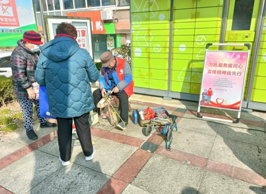 此外,活動(dòng)現(xiàn)場還設(shè)置了磨刀區(qū)、理發(fā)區(qū)以及問題答疑區(qū)。磨刀師傅們耐心地為居民們打磨舊刀具、剪刀,讓它們煥然一新。理發(fā)師們則為居民們提供了簡單發(fā)型的免費(fèi)義剪服務(wù),讓大家在新的一年里煥發(fā)新氣象。問題答疑區(qū)的工作人員們則化身“智囊團(tuán)”,耐心解答老年居民們在智能手機(jī)維修、app下載卸載、養(yǎng)老保險(xiǎn)認(rèn)證等方面的基礎(chǔ)問題,幫助他們更好地適應(yīng)現(xiàn)代生活。