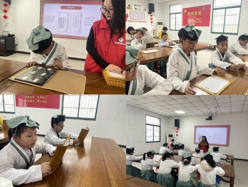 活動現(xiàn)場,“童”學(xué)們身著唐裝,手捧竹簡,目不轉(zhuǎn)睛的欣賞志愿者老師精心準(zhǔn)備的《望岳》、《無題》等郵票......“杜甫《望岳》詩采用楷體書寫,書法采用唐代顏真卿作品集字,沉穩(wěn)厚實,表現(xiàn)了詩人雄心氣魄;李商隱《無題》郵票,畫面設(shè)計為卷起的古版《唐詩三百首注疏》刻本《無題》頁面。”這些郵票以唐詩為主題,通過郵票設(shè)計師的巧妙構(gòu)思和精湛技藝,將唐詩的意境和韻味融入郵票圖案之中,詩意濃厚,展現(xiàn)了唐詩的獨特魅力和豐富內(nèi)涵。同時,志愿者還為大家講解每一張郵票背后的故事,以及古詩的韻律和意境?,F(xiàn)場氣氛熱烈而溫馨。