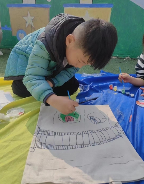 隨后,孩子們將自己眼中的春天畫到了帆布包上。他們或蹲或坐,或低頭沉思或揮筆作畫,每個人都沉浸在自己的創(chuàng)作中。在他們的筆下,春天變得栩栩如生,花朵綻放、綠草如茵、小鳥歡歌,一幅幅充滿生機與活力的春天畫卷展現在大家面前。