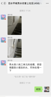 近日,百水芊城社區(qū)秀水坊八幢三單元的居民發(fā)現(xiàn)樓道內(nèi)的線路管道翹起來(lái)了,上下樓時(shí)候很容易戳到小朋友的頭,存在安全隱患,于是通過(guò)“掌上云”微信向社區(qū)反映此情況,希望得到關(guān)注和妥善解決。