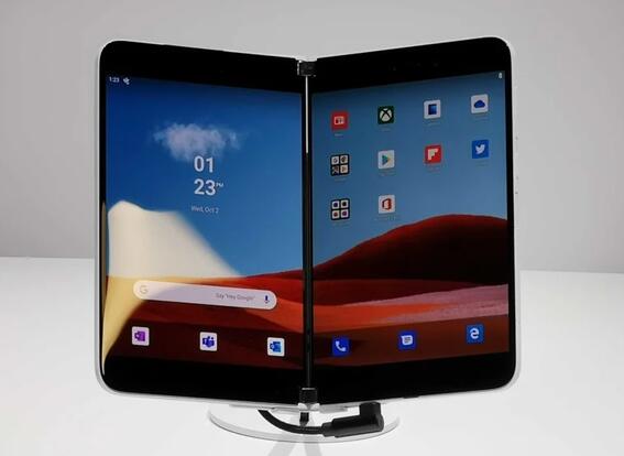 這款手機(jī)最大的亮點(diǎn)是雙屏設(shè)計(jì),Surface Duo配備了兩塊5.6英寸顯示屏,兩塊屏幕通過(guò)鉸鏈連接,展開后的屏幕尺寸為8.3英寸。