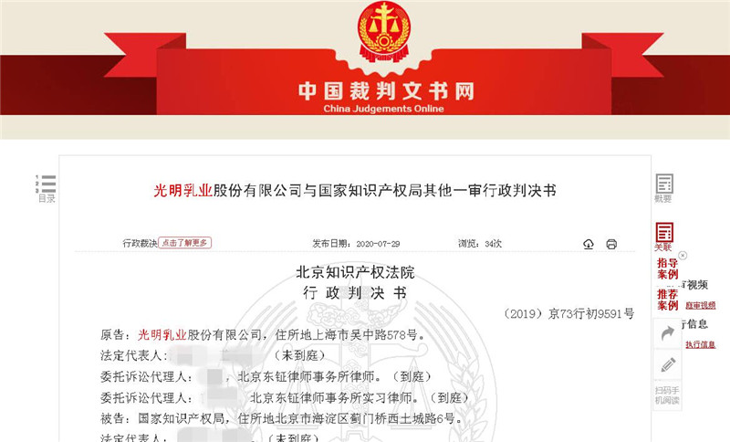 2019年8月,光明乳業(yè)不服此裁定,一氣之下將國家知識產(chǎn)權(quán)局告上法庭,請求北京知識產(chǎn)權(quán)法院依法撤銷裁定,并判令國家知識產(chǎn)權(quán)局重新作出裁定。