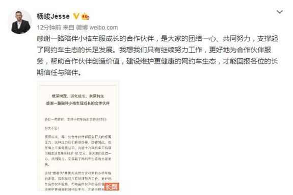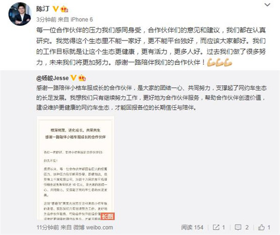 小桔車服總經(jīng)理陳汀通過微博轉(zhuǎn)發(fā)了這一內(nèi)容,表示合作伙伴們的意見和建議都在認(rèn)真研究。這個生態(tài)里不能一家好,更不能平臺獨好,而應(yīng)該大家都好,希望這個生態(tài)更健康,更有活力,未來也將更加努力。