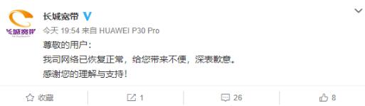 19點(diǎn)54分,長城寬帶官微發(fā)布簡短聲明稱,網(wǎng)絡(luò)已恢復(fù)正常,帶來不便,深表歉意,但未做進(jìn)一步解釋。