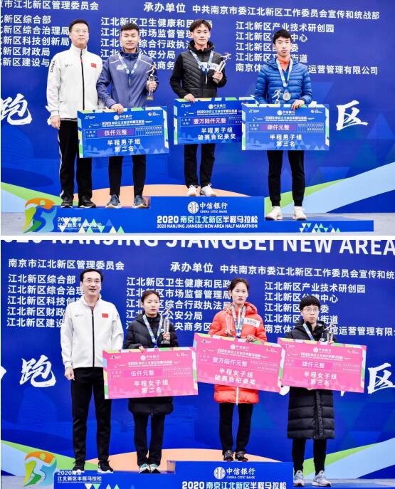 伴隨著青春活力的快閃舞蹈和激昂的國(guó)歌合唱,4500名跑者用腳步暢跑江北,以行動(dòng)樂(lè)享新區(qū)。經(jīng)過(guò)激烈的角逐,李恩基獲得半程男子組冠軍,成績(jī)?yōu)?:07:50 。半程女子組冠軍由王佳莉以1:16:40的成績(jī)摘得。值得一提的是,此次中信銀行·2020南京江北新區(qū)半程馬拉松男女組冠軍成績(jī)均打破賽會(huì)紀(jì)錄。在首屆賽事的基礎(chǔ)上,本屆賽事在獎(jiǎng)項(xiàng)設(shè)置上也更加豐富,不僅新增了破賽會(huì)紀(jì)錄獎(jiǎng),還新增了跑團(tuán)賽中賽獎(jiǎng),給更多非專業(yè)跑者一爭(zhēng)殊榮的機(jī)會(huì)。