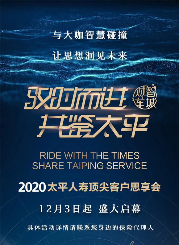 面對(duì)即將到來(lái)的2021年,中國(guó)太平聯(lián)合中國(guó)頂級(jí)經(jīng)濟(jì)金融智庫(kù)-長(zhǎng)江商學(xué)院,與太平的伙伴、客戶(hù)朋友一道,共同探索下一個(gè)十年,與客戶(hù)并肩描繪未來(lái)的美好藍(lán)圖,馭時(shí)而進(jìn),共鑒太平。作為金融保險(xiǎn)央企——中國(guó)太平保險(xiǎn)集團(tuán)有限責(zé)任公司旗下成員公司,太平人壽踐行央企擔(dān)當(dāng),將于12月3日至12月4日舉辦“馭時(shí)而進(jìn) 共鑒太平”財(cái)智聯(lián)城高端客戶(hù)思享會(huì)。