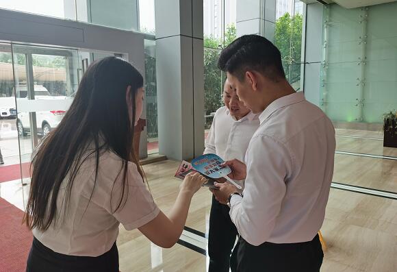為更好地普及防非知識(shí)及《條例》內(nèi)容,太平人壽江蘇分公司于6月25日在置地廣場(chǎng)辦公樓一樓大廳開展集中宣傳活動(dòng)。制作了以“學(xué)法用法護(hù)小家·防非處非靠大家”、“《防范和處置非法集資條例》于5月1日起正式施行”等主題展板,營(yíng)造濃厚的宣傳氛圍。此外,還制作了防非知識(shí)三折頁以及防非口號(hào)宣傳扇,宣傳扇上印制“學(xué)法用法護(hù)小家,防非處非靠大家、保險(xiǎn)助力保民生,欺詐騙保必嚴(yán)懲、防范洗錢嚴(yán)守法,金融安全你我他”宣傳口號(hào),在炎炎夏日讓金融知識(shí)給大家?guī)硪魂嚽屣L(fēng)。本次共計(jì)發(fā)放宣傳扇及防非三折頁170余份,現(xiàn)場(chǎng)還提供金融知識(shí)咨詢服務(wù),參與活動(dòng)人員可以與工作人員交流自己對(duì)金融和保險(xiǎn)方面的疑惑。