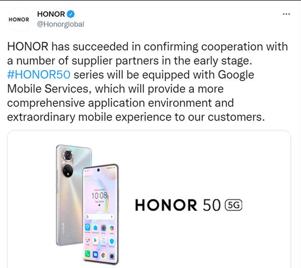 11日晚,榮耀海外官方社交平臺發(fā)布消息確認,目前榮耀已恢復(fù)與谷歌的合作,榮耀50系列海外版本將搭載Google Mobile Services(GMS)。