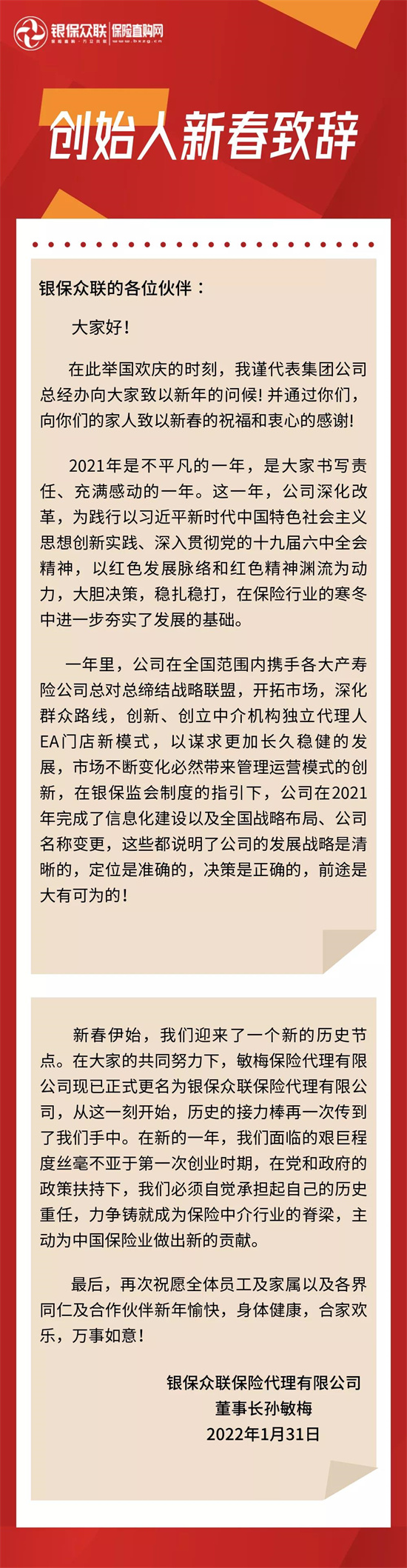 除夕將至,銀保眾聯(lián)保險代理有限公司創(chuàng)始人孫敏梅向全體員工及家屬、各局領導、各界同仁以及合作伙伴致以新春祝福!