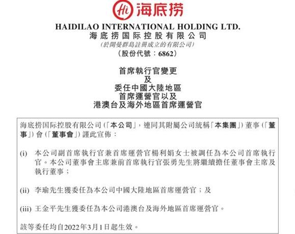 3月1日晚,海底撈發(fā)布管理層多項(xiàng)人事任命公告,其中包括海底撈現(xiàn)任CEO張勇卸任,由公司副CEO楊利娟接替,張勇將繼續(xù)擔(dān)任海底撈的董事會主席及執(zhí)行董事職務(wù)。