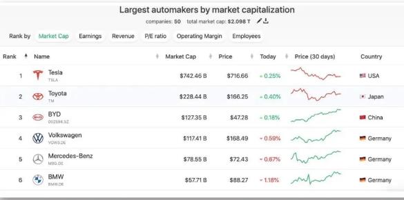 根據(jù)全球最新車企市值排行榜,比亞迪躋身全球第三,總市值為1273.5億美元,反超大眾集團(tuán),是前十排行榜中唯一一家中國車企。特斯拉仍是全球市值第一車企,以7424.6億美元遙遙領(lǐng)先,市值幾乎是比亞迪的6倍。