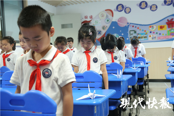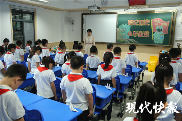 “特別提醒各位同學,今天警報聲響起時,請你放下手中的事,停下腳步,靜靜地站在原地默哀。”南師附小大隊輔導員胡穎告訴記者,希望每位同學銘記這個屈辱的日子,為戰(zhàn)爭中無數(shù)的英烈悼念、默哀,學校在每個班級門口都掛起了國旗,還在防空警報響起前開設了一節(jié)晨會課,通過廣播的形式,告訴同學們九一八事變的這段歷史,希望他們珍愛和平、勤奮學習、嚴于律己、報效祖國。