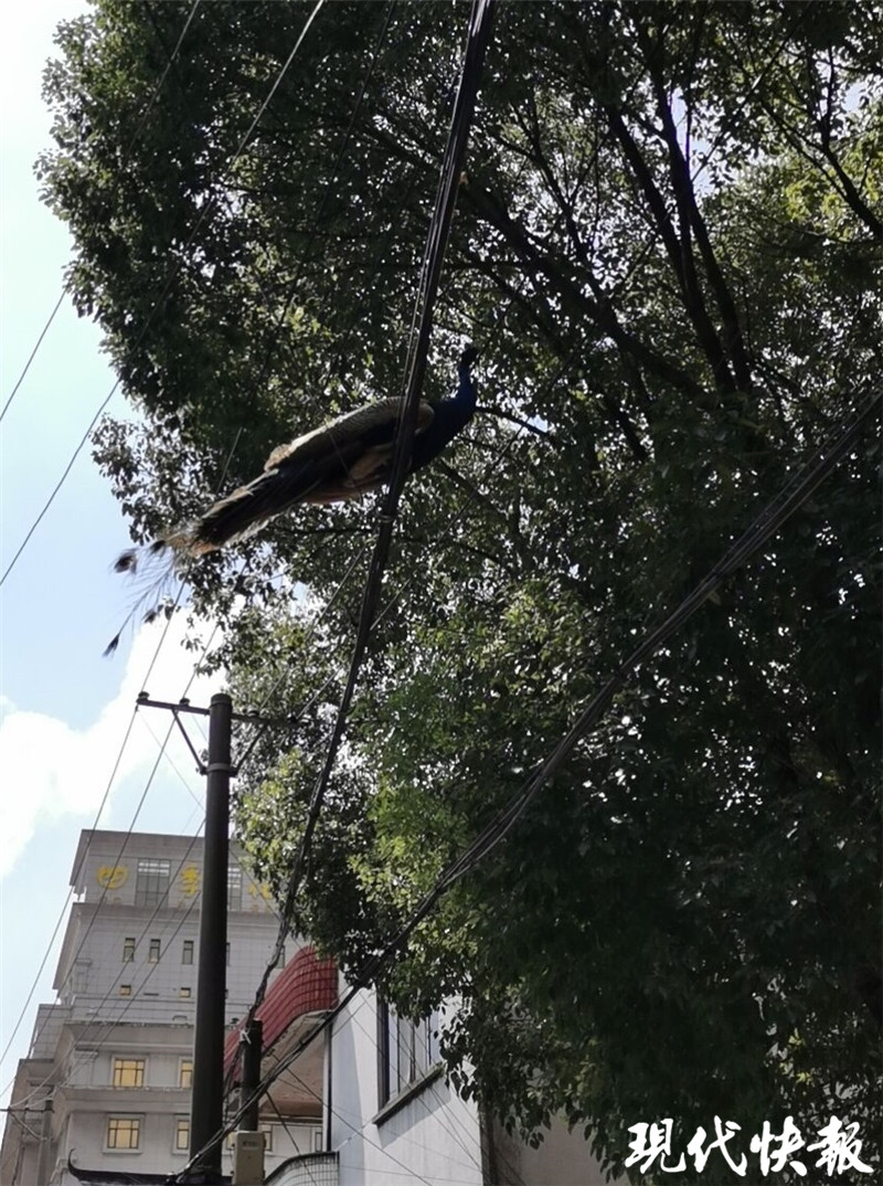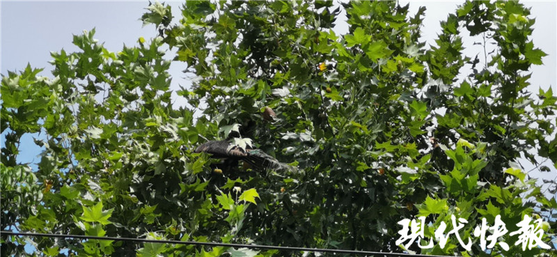 9月1日,常熟市公安局興福派出所接群眾報警稱,黃河路郵政小公園一棵梧桐樹上立著一只孔雀。接到報警后,派出所一面聯(lián)系常熟市消防大隊黃河路中隊尋求幫助,一面安排民警攜帶抓捕裝備前往現(xiàn)場?,F(xiàn)場,許多群眾正在圍觀,民警在報警人的指引下見到了這只迷途的孔雀。只見它泰然自若立在離地約6米高的梧桐樹樹冠上,正悠閑地享受著傍晚的涼風(fēng)。