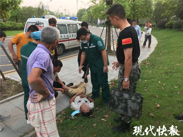 9月9日下午,海安市海安街道新橋社區(qū)民兵營營長于愛榮,駕車送剛從海安征兵辦審?fù)晷卤鴻n案的宋超前往火車站。宋超剛下車,就發(fā)現(xiàn)站臺門前的草坪上,一名小伙在地上打滾,渾身抽搐,旁邊的兩名市民急得不知所措。聽到求救聲,顧不得多想,宋超本能沖了過去,用急救技能立即對小伙展開救治,于愛榮則連忙撥打急救電話。