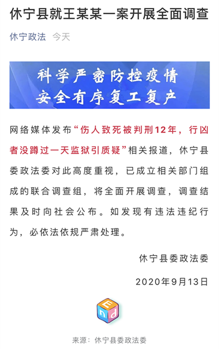 9月13日,安徽省黃山市休寧縣委政法委在其官方微信公眾號上發(fā)布消息稱,網(wǎng)絡媒體發(fā)布“傷人致死被判刑12年,行兇者沒蹲過一天監(jiān)獄引質疑”相關報道,休寧縣委政法委對此高度重視,已成立相關部門組成的聯(lián)合調(diào)查組,將全面開展調(diào)查,調(diào)查結果及時向社會公布。如發(fā)現(xiàn)有違法違紀行為,必依法依規(guī)嚴肅處理。