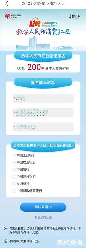 值得注意的是,滿足以上兩個條件之一的個人,可以在12月5日0時至12月6日24時期間,通過“蘇周到”APP的“雙12紅包”入口,進行預約報名登記。12月11日,預約報名人員可以通過“蘇周到”APP查詢中簽結果,系統也將根據報名時預留的手機號碼通過短信通知到中簽人員。中簽人員根據操作指引下載“數字人民幣”APP、開立個人數字人民幣錢包、領取消費紅包。